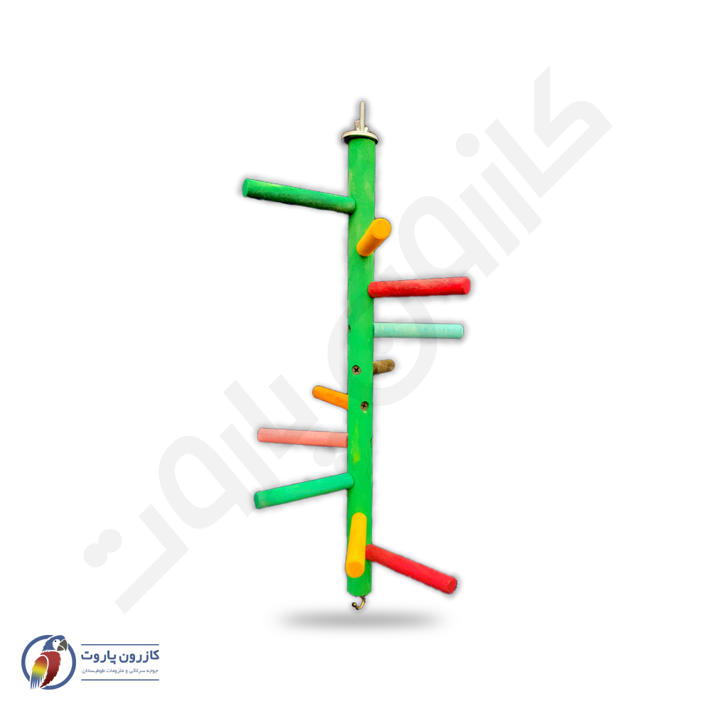 این نشیمن گاه حالت بازی برای طوطی شما دارد.حالت پله مانند و چرخش چوب به حرکت طوطی شما زیبایی میبخشد.ارتفاع نشیمن گاه 40cm است که با دو نوع قلاب قابل نصب برروی تمامی قفس ها است که میتوانید از یه قلاب برای آویز و اسباب بازی های دیگه ای هم استفاده کنید.11 عدد چوب به صورت مارپیچ دارد که به طوطی شما کمک میکند به نقاط مختلف قفس دسترسی داشته باشد و نقل مکان کند.رنگ ها همگی به صورت خوراکی هستند.